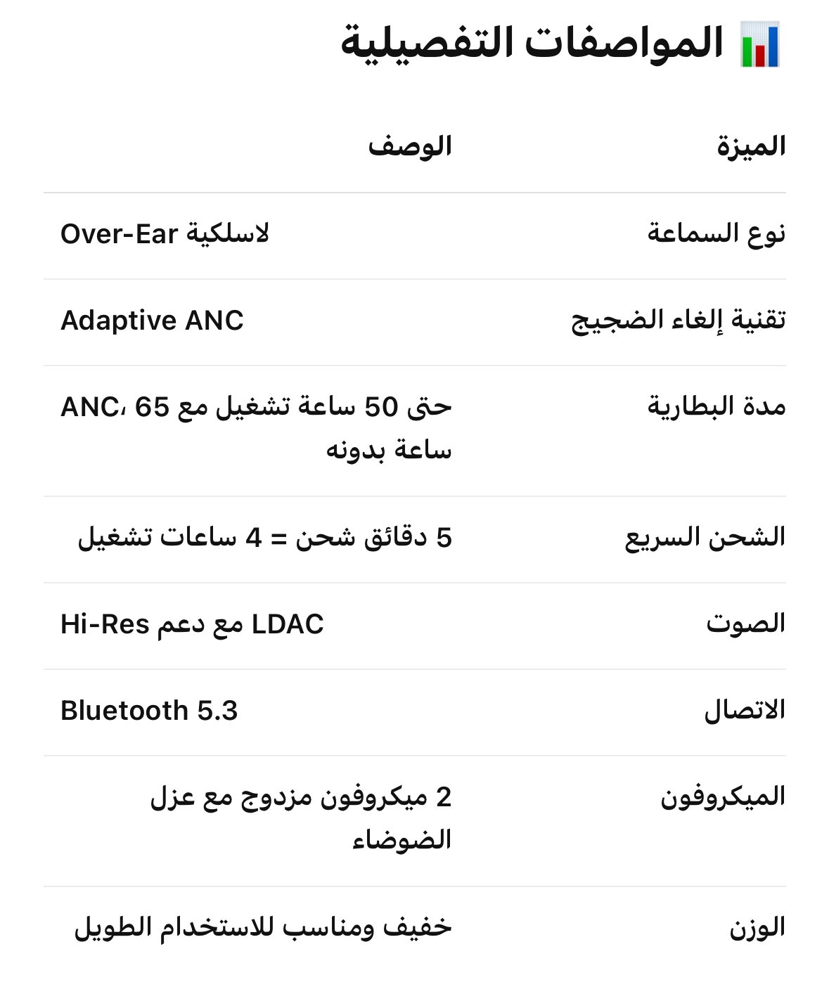 - بطارية طويلة المدى: حتى 50 ساعة تشغيل متواصل أو 65 ساعة مع إيقاف الـ ANC.